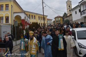 Στήν συνέχεια ξεκίνησε ἡ λιτανευτική πομπή, ἀπό τόν Μητροπολιτικό Ναό πρός τό σημεῖο «Σταυρός», γιά τόν καθαγιασμό τῶν ὑδάτων καί τήν ρίψη τοῦ Τιμίου Σταυροῦ στά κρύα νερά τῆς λίμνης, συνοδεία, ἀγήματος τοῦ Στρατοῦ καί Συλλόγων μέ παραδοσιακές φορεσιές.